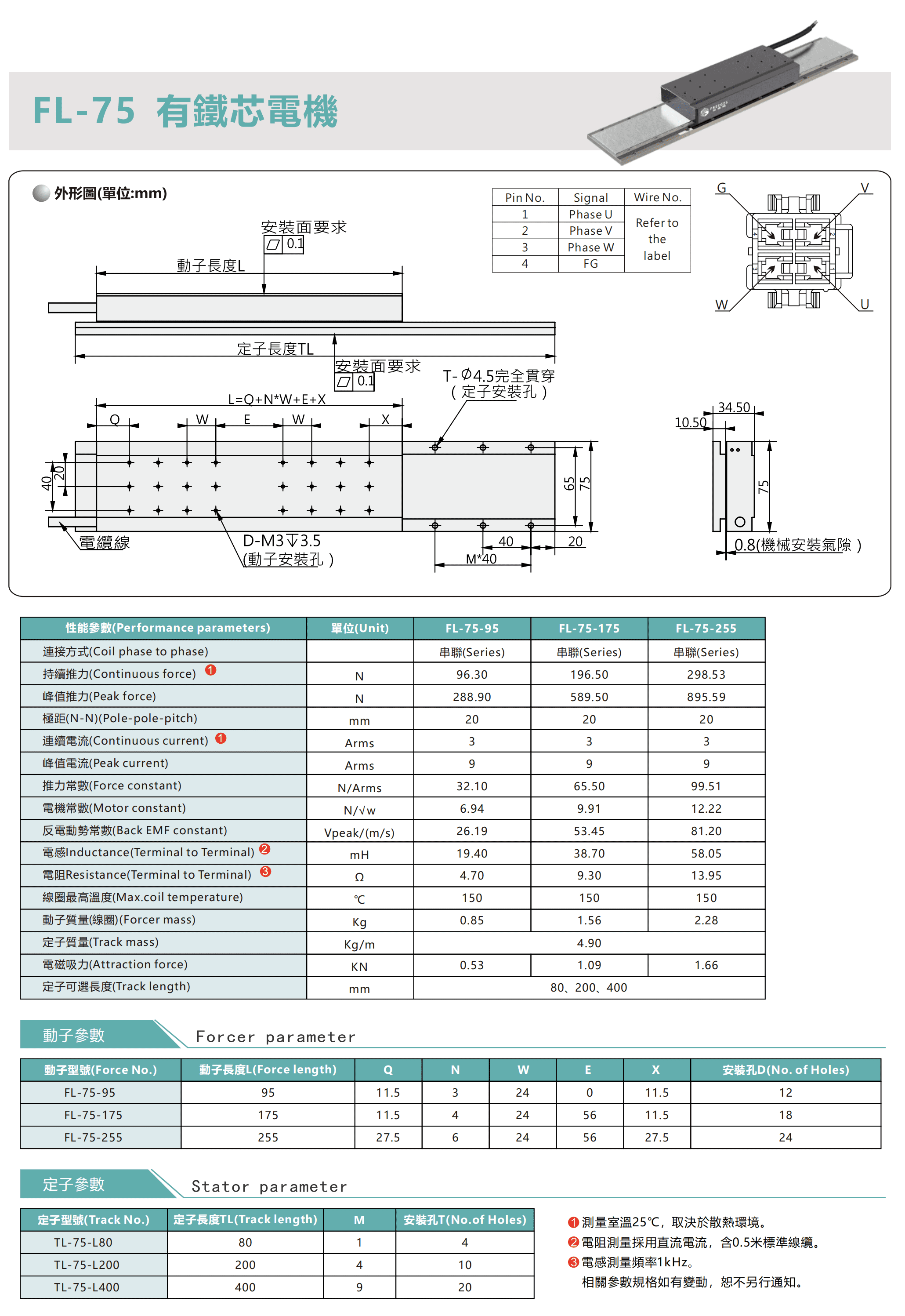 FL系列為有鐵芯直線電機,單位體積最大推力,結構小巧緊湊,低吸力,適應于對馬達推力要求較高的應用。