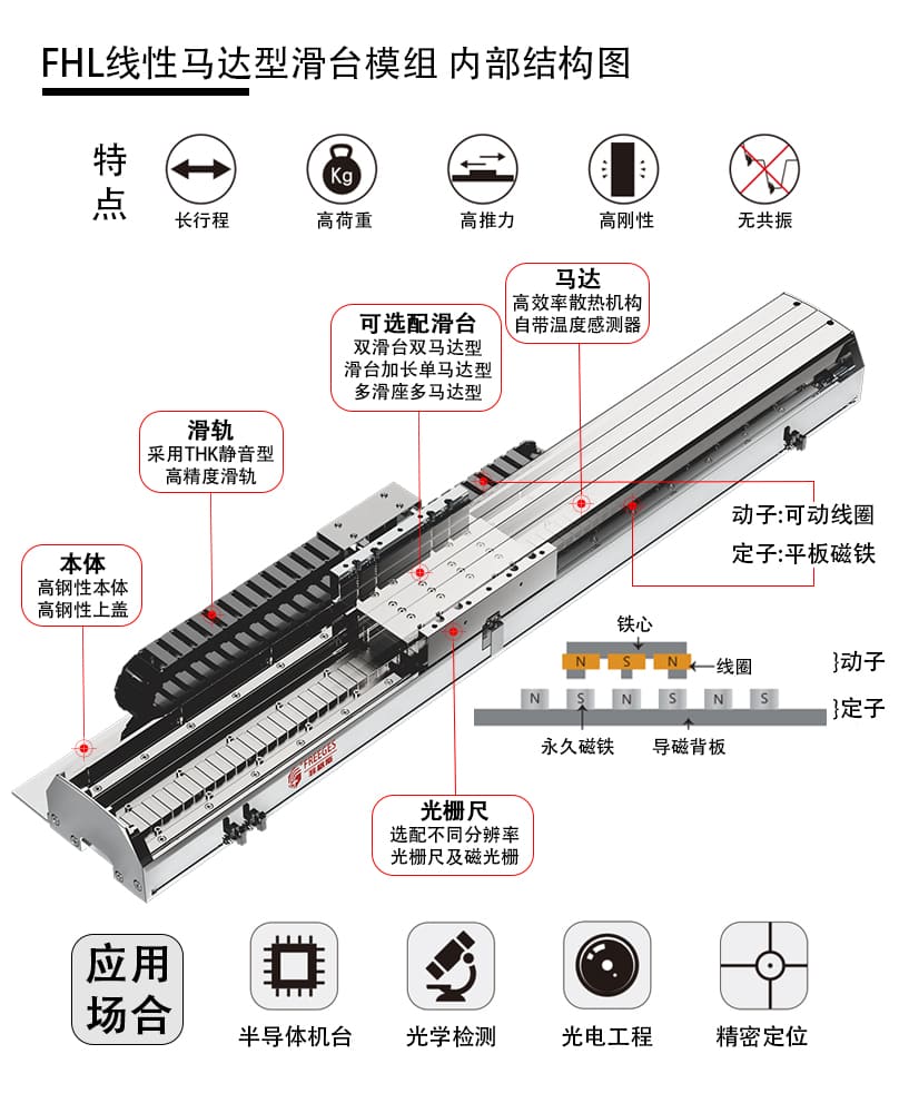 FHL有鐵芯電機模組系列為高性能直線電機直驅定位系統。由雙導軌、直線電機、編碼器反饋和鋁制外殼組成緊湊,高性能平臺。